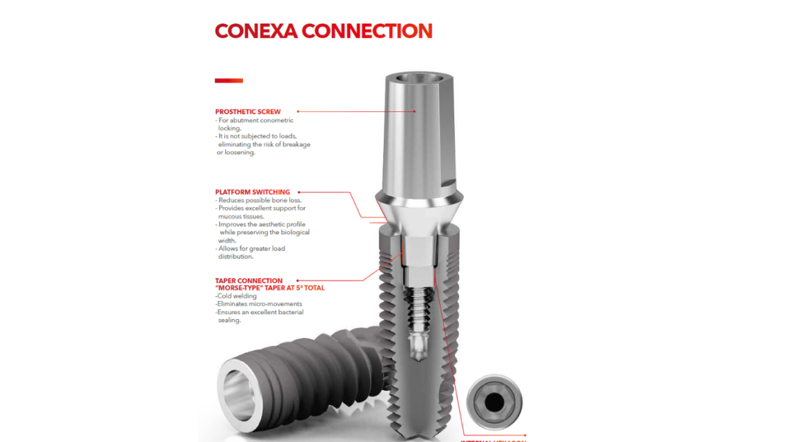 - Mbyllje hermetike: Lidhja Conexa siguron një mbyllje të plotë ndërmjet implantit dhe abutmentit, duke parandaluar infiltrimin e baktereve dhe duke reduktuar rrezikun e infeksioneve.